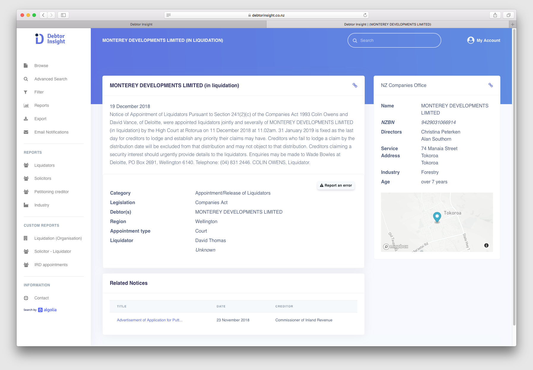 Debtor Insight is used by leading liquidation practices, credit managers and financiers in New Zealand to identify credit risk and business oppportunities.